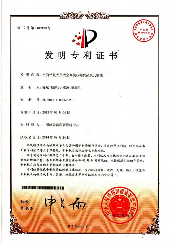 神舟太空食物高科技(深圳)无限公司独家具有中国航天员科研锻炼核心的空间坐航天员食物专利手艺——《空间坐航天员高能压缩食物及其制法》,